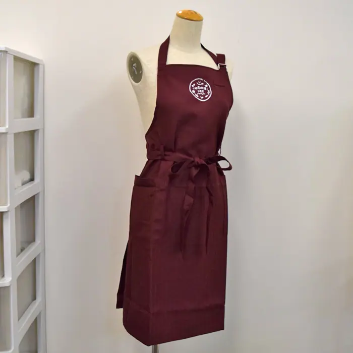 胸付エプロンのロゴ刺繍は胸中央にこれくらいのサイズで刺繍するとかわいいですよね。糸色はあまり多くしないほうがベターです。