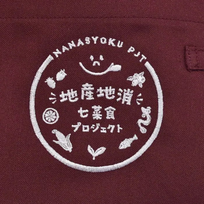 お野菜やおさかなの描かれたデザインを1色白色の糸色で丁寧に刺繍いたしました。素敵なオリジナル販売店ユニフォームができありました。