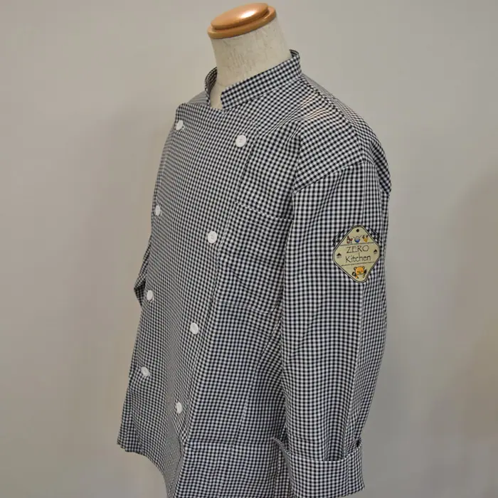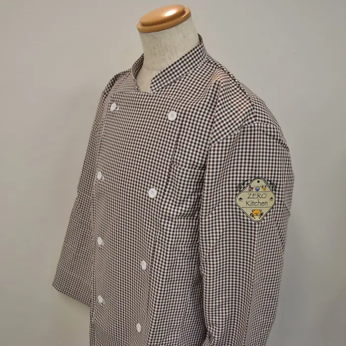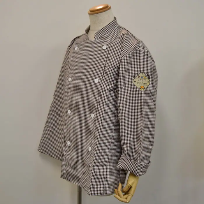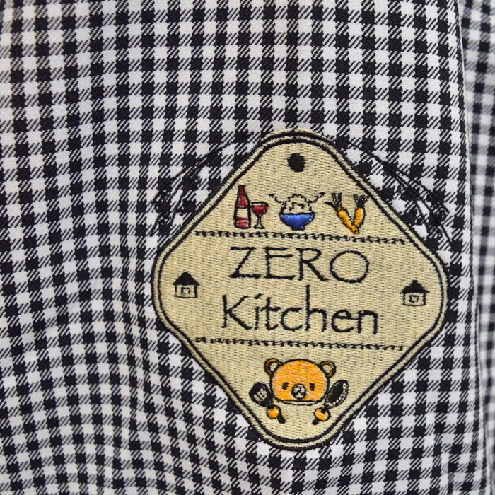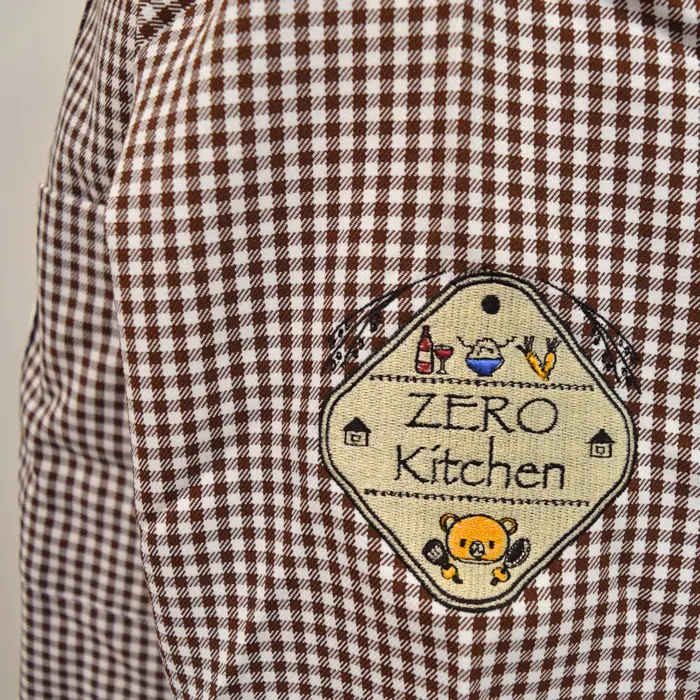 かわいいギンガムチェックのコックコートの左腕に、これまたかわいいワッペン風ロゴの刺繍をさせていただきました。