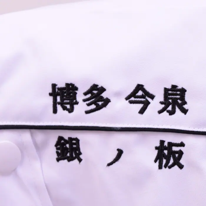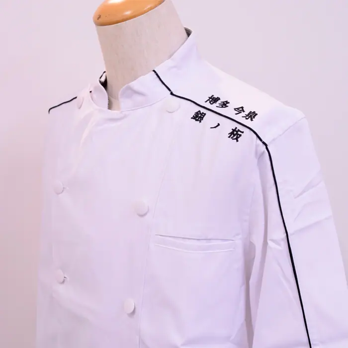 パイピングが特徴のコックコートに明朝体でシンプルに刺繍しました。胸付エプロンをつけてもネーム刺繍が見えるように、 お客様と何度かメールにて画像のやり取りをして左肩に刺繍しました。