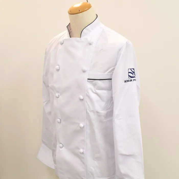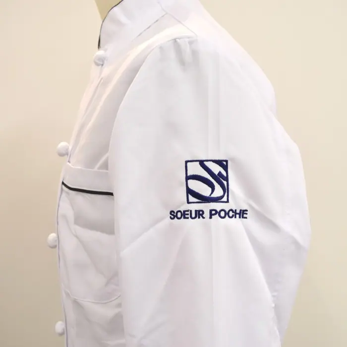 細身のシャツの場合に袖に長袖の刺繍は出来ないことがまれにありますが、コックコートの場合は袖幅が大きく刺繍はしやすいので是非刺繍をご相談ください。