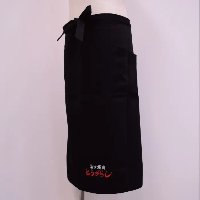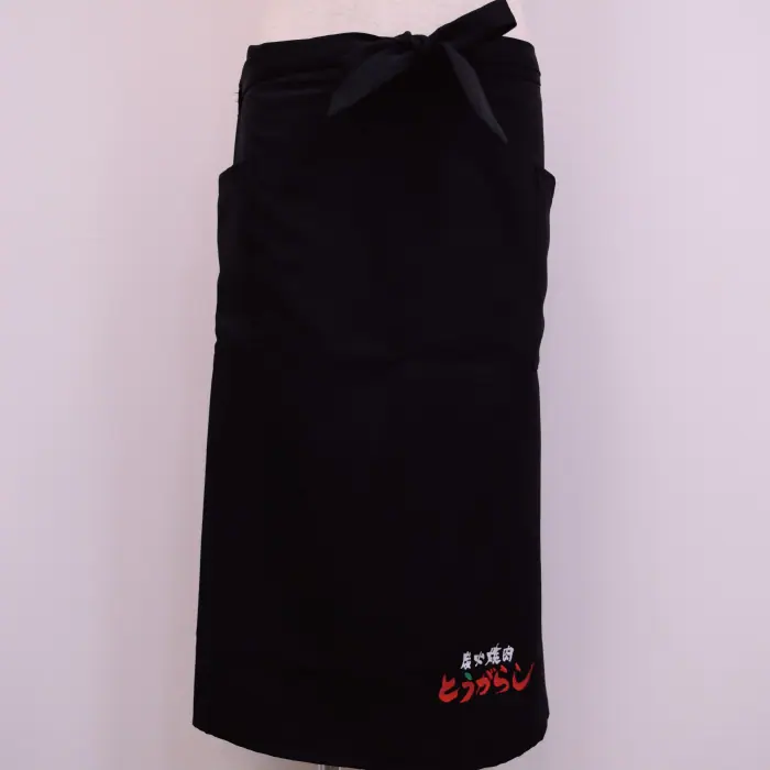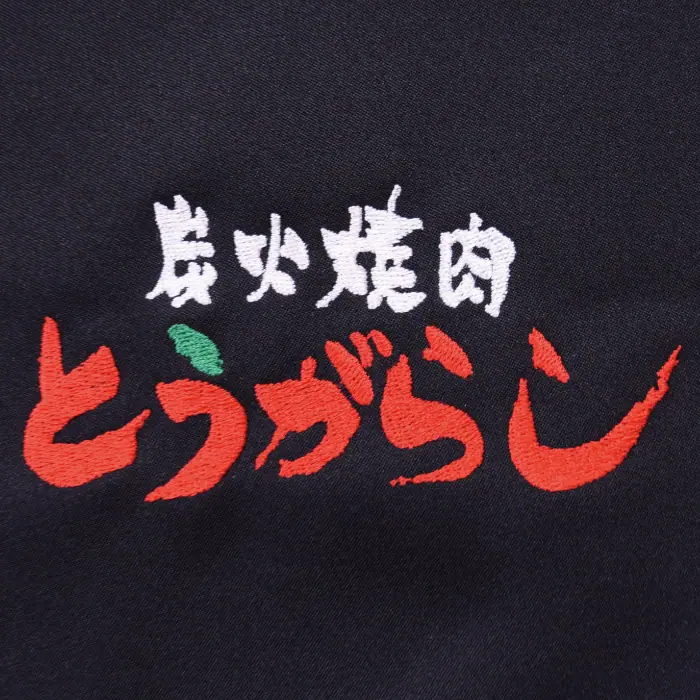 筆で書いたかのような炭火焼肉という白い刺繍と、赤いとうがらしの文字に、緑を入れて唐辛子をイメージさせる素敵なロゴですね。 こちらは腰下エプロンバージョンとなっており、たすき型エプロンにも刺繍をしています。 刺繍のために頂いた画像データでは、「炭火焼肉」の部分は黒だったのですが、黒のエプロンに刺繍したいので白糸を希望とのご要望を頂き、 ご依頼通りに白糸で刺繍させていただきました。
