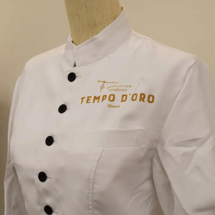 TOP オリジナル加工刺繍・プリント実績 転写プリント コックコート 転写プリント実績 コックコート 胸付エプロン 腰下エプロン コックコート Tシャツ・シャツ・ポロ 作務衣・調理白衣 帽子・ベストその他 1件の商品が見つかりました オリジナル制服製作実績 転写プリント /TEMPO D’ORO様/飲食店サービス制服ユニフォームナイスユニ 転写プリントコックコート