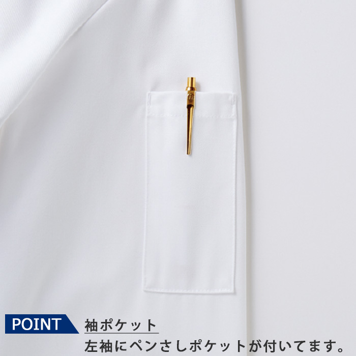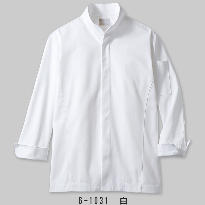 スタンドカラーとシングルの前合わせが洗練された印象のコックコート。しっかりした生地で厨房でも使え、シャープなスタンドカラーが高級感を演出します。強度の高いステンレス性のスナップボタンは着脱しやすく調理にも邪魔になりません。