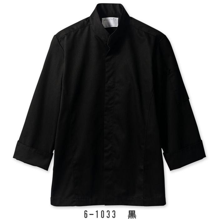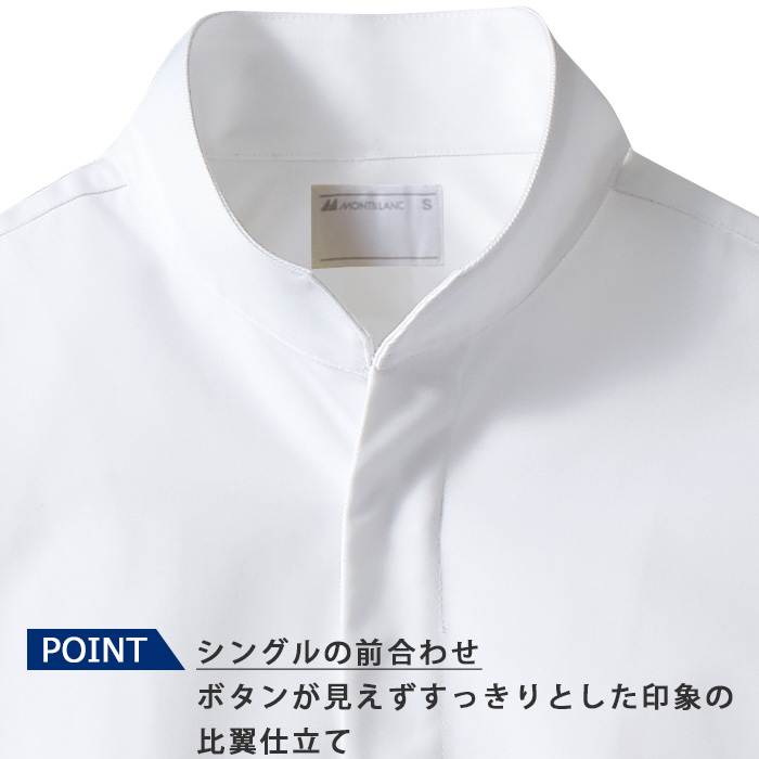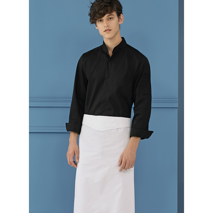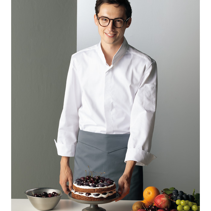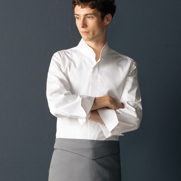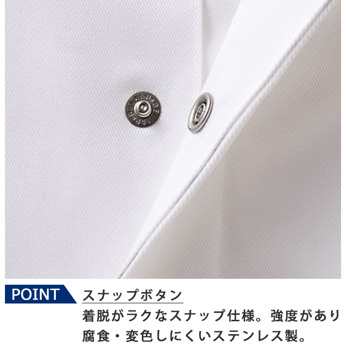 しっかりした生地で厨房でも使え、シャープなスタンドカラーが高級感を演出します。強度の高いステンレス性のスナップボタンは着脱しやすく調理にも邪魔になりません。