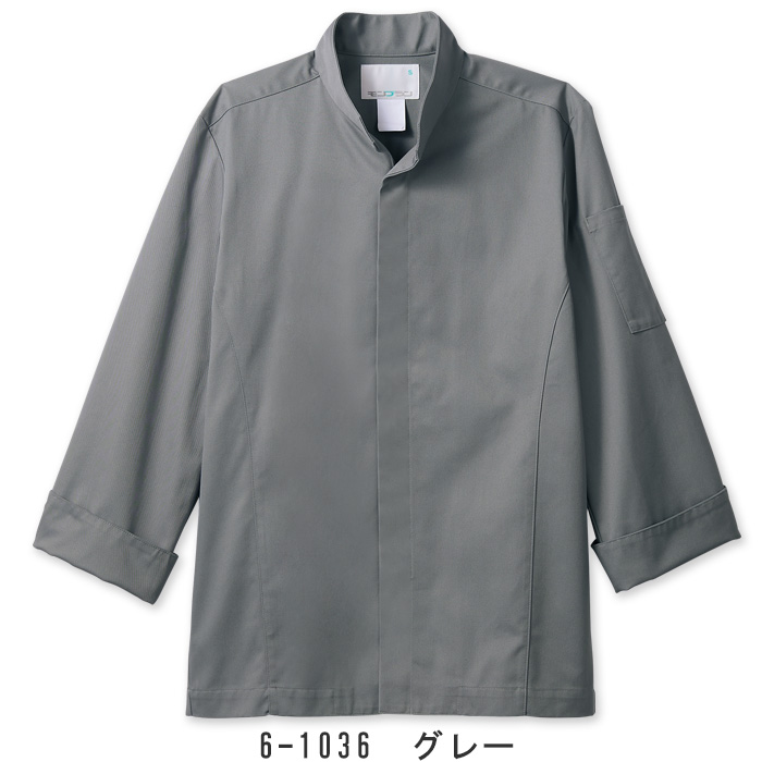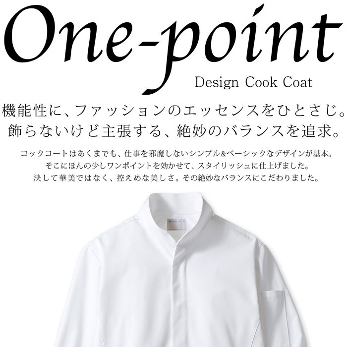 スタンドカラーとシングルの前合わせが洗練された印象のコックコート。