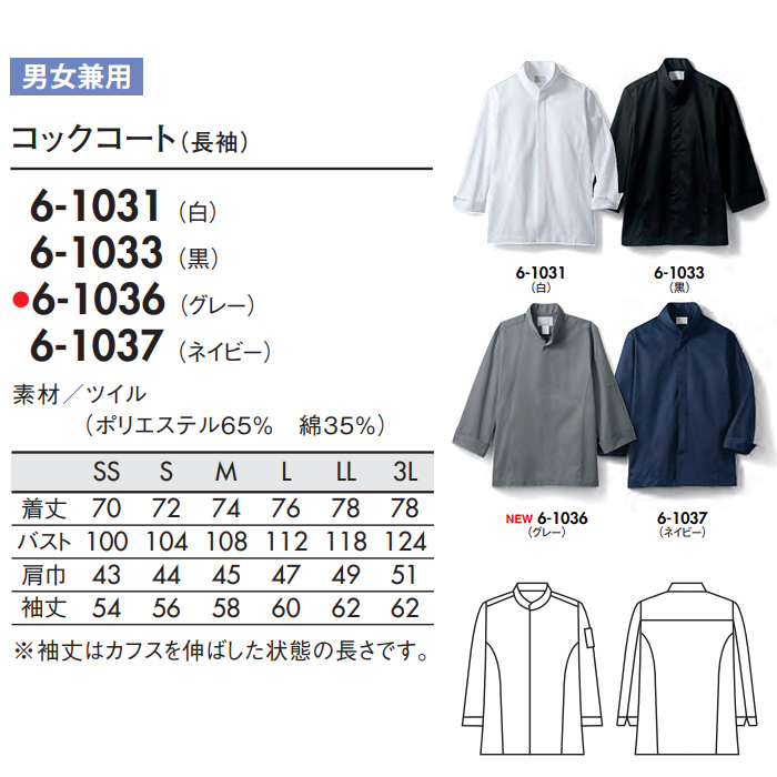 • ドラマで採用 スタイリッシュな長袖コックコート【4色】男女兼用 スペック