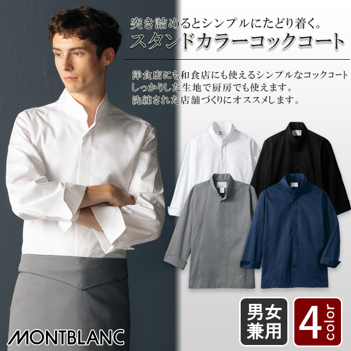 飲食店販売店ユニフォーム シンプルさと高級感が特徴のスタンドカラーコックコート