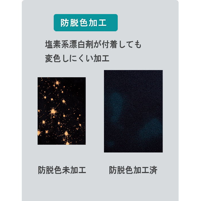 可愛いエプロンなのに防脱色加工で塩素系漂白剤に強く、変色しにくくなっていますので長くきれいを保てます。