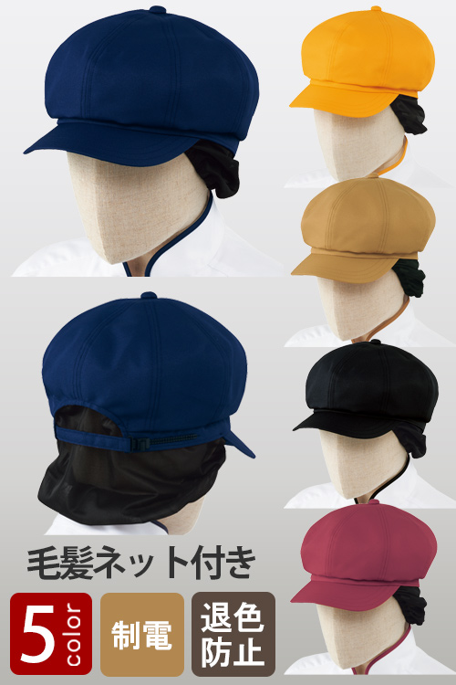 【飲食店販売店制服】毛髪落下防止ネット付 アジャスターでサイズ調節ができるキャスケット【5色】