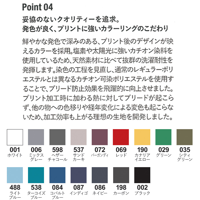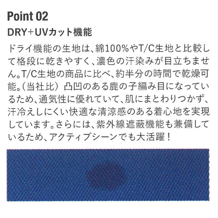 ポリ100%でシワになりにくく、乾きやすい、濃い色も色落ちがないです。