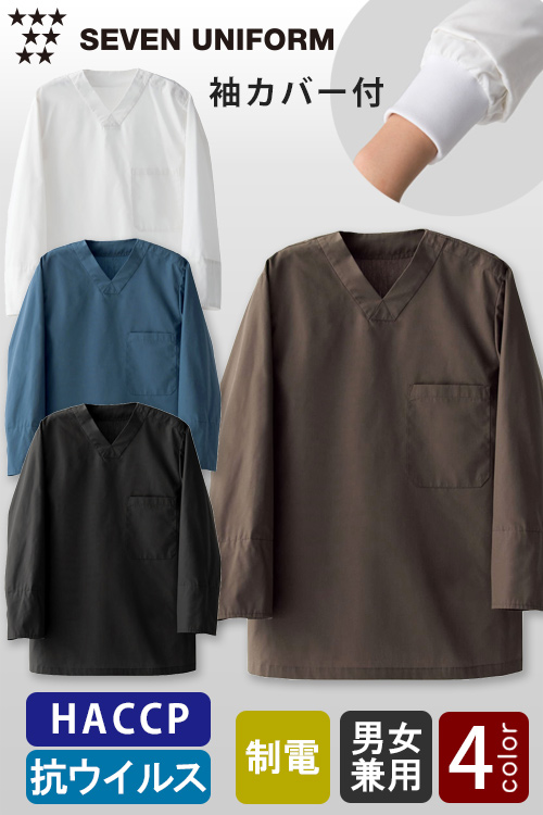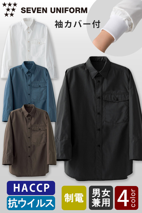 抗ウイルス加工&袖カバー付 HACCP対応8分袖ノーカラーシャツ【4色】兼用