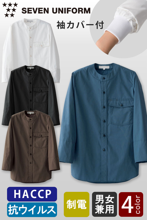 【飲食店販売店制服】抗ウイルス加工&袖カバー付 HACCP対応 8分袖ノーカラーシャツ【4色】兼用