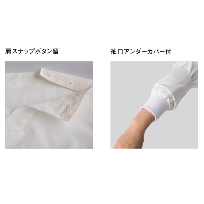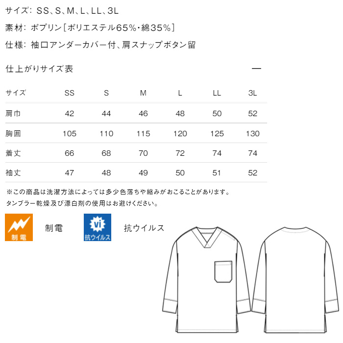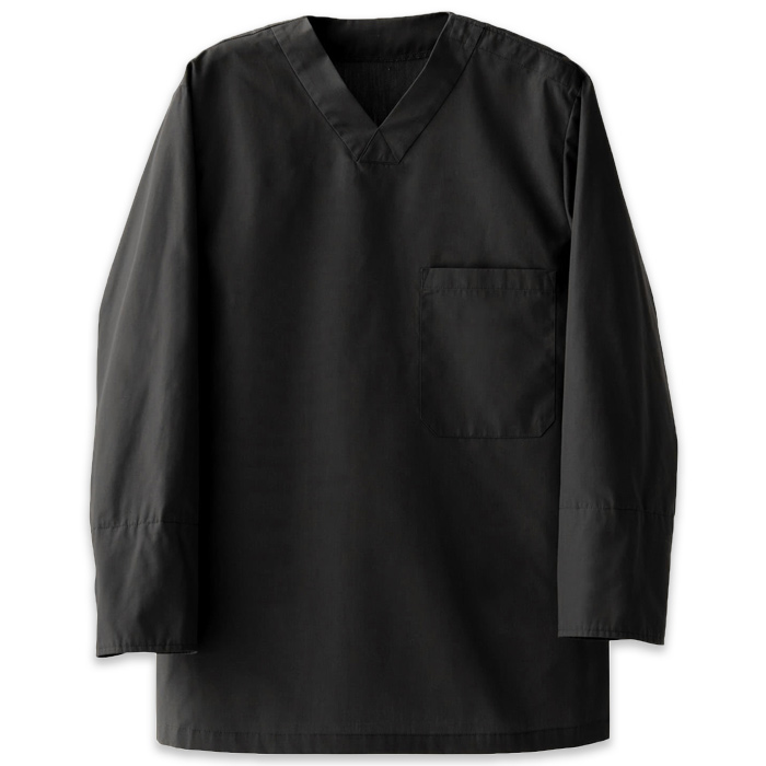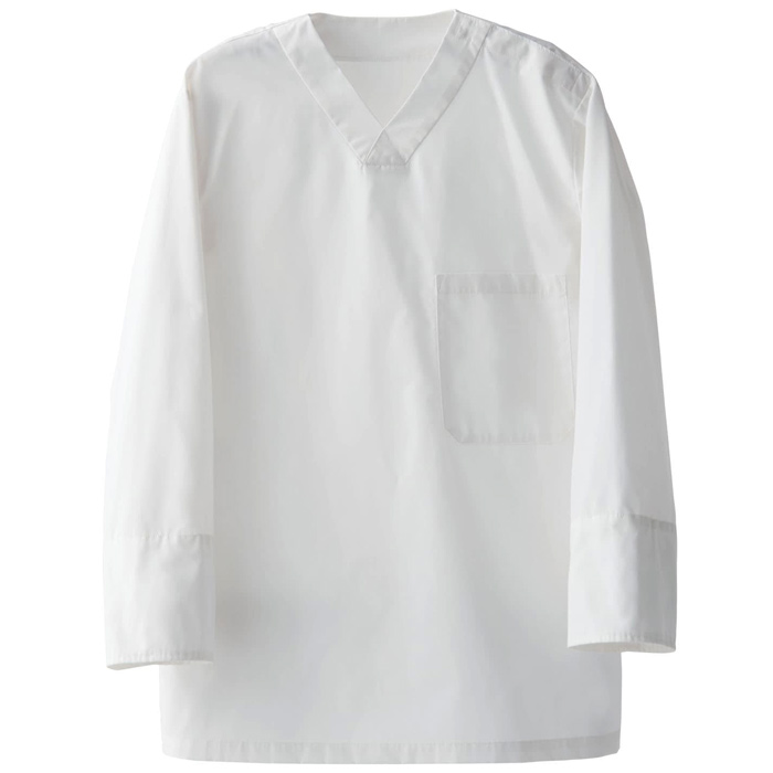 袖口にアンダーカバーを配したHACCP対応商品。カジュアル感のあるワーキングテイストのデザインのシンプルな8分袖シャツ。Vネックデザインのプルオーバーシャツ。洋でも和でも使えるデザインです。定番のシャツ生地に抗ウイルスの機能を追加した素材を使用し、強度と安心感を両立しました。