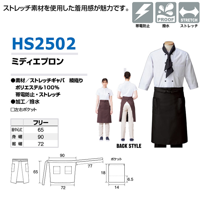 丈65cm ミドル腰下エプロン15色ストレッチ・撥水・制電加工
