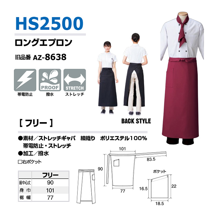 【飲食店販売店制服】丈90cm ソムリエロングエプロン15色 ストレッチ・撥水・制電加工AZ8638