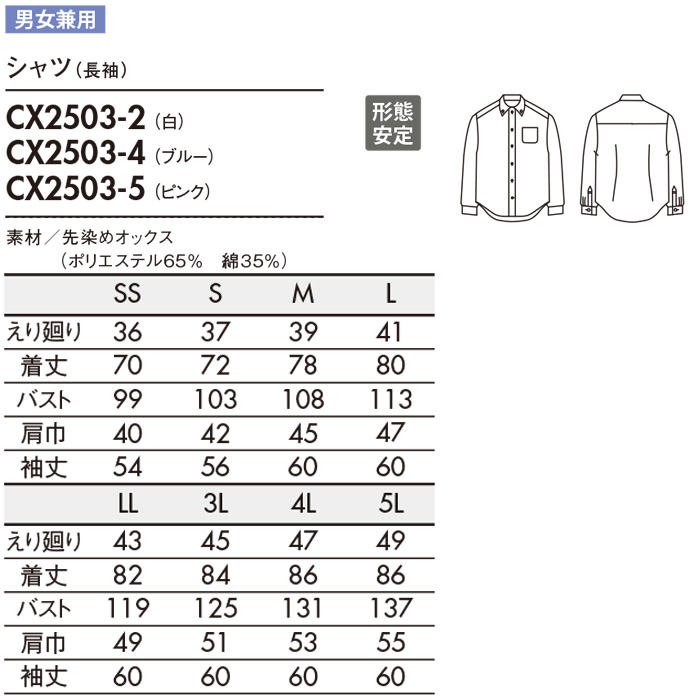 【飲食店販売店制服】シャツ 長袖【兼用】SS~5Lまで 形態安定で清潔感のあるシャツ