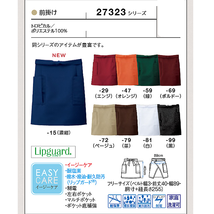 ¥3,190耐久撥水性・撥油性に優れていて水や油などの汚れが付きにくく、洗濯で落ちやすい前掛けエプロンです。シワになりにくく洗濯耐久性にも優れていてイージーケア製品。