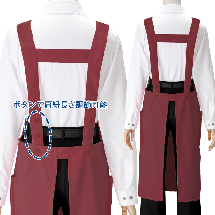 H型なので肩紐が落ちにくいエプロンです。後ろのボタンで幅の調整ができます。