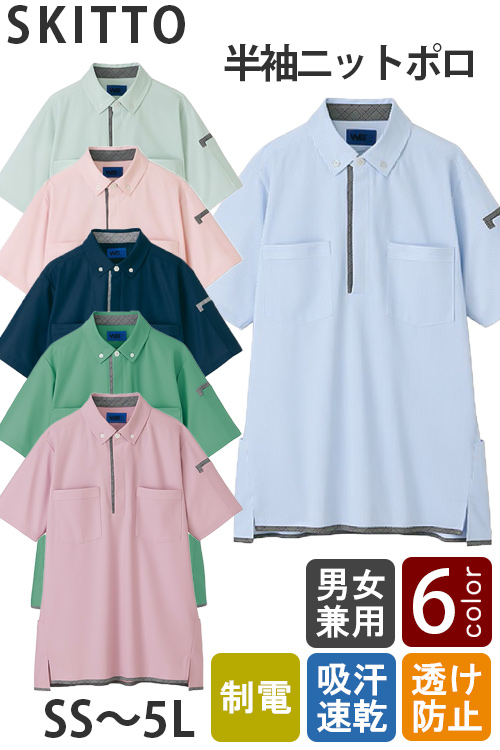 ノンストレスな着心地のこだわりニット半袖シャツ。男女兼用SS~5Lサイズ。元気の出る明るい3色展開。細めのストライプが爽やかで好印象を与えてくれます。胸元と袖のグレンチェック柄もアクセントです。どんな動きにも合わせて伸びてくれるぐ~んと伸びるニット素材。毎日のお仕事をサポートしてくれるきちんと見えて動けるユニフォームです。清掃・介護・幼稚園・保育園などにオススメです。