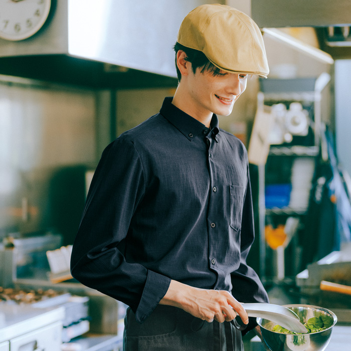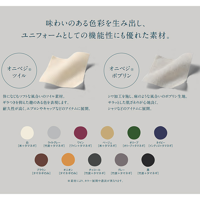 環境に配慮した地球に優しい制服。野菜や植物で染めた自然の色です。シンプルな定番デザインだからこそ、ナチュラルな風合いで差が付く帽子。