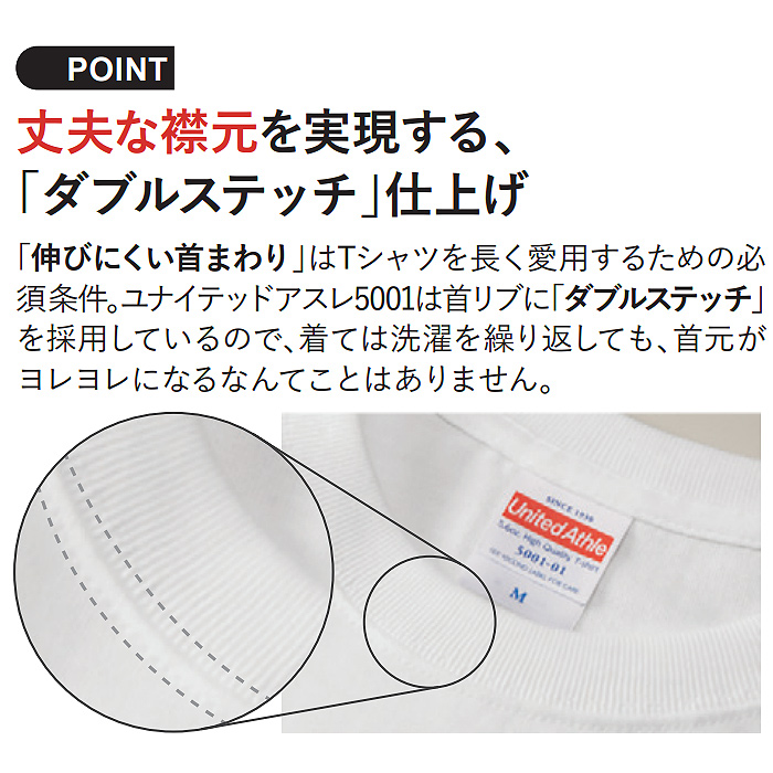 リリースから10年以上、United Athleの代表格として人気のシリーズ。業界最多数級のカラーバリエーションの豊富さはオリジナルTシャツ作成用のベースとして最適で上質な一枚に仕上げています。丈夫な首もとを実現するため、首まわりの縫製に「ダブルステッチ」を採用。長年愛用いただいてもきちんとした首まわりを保ちます。