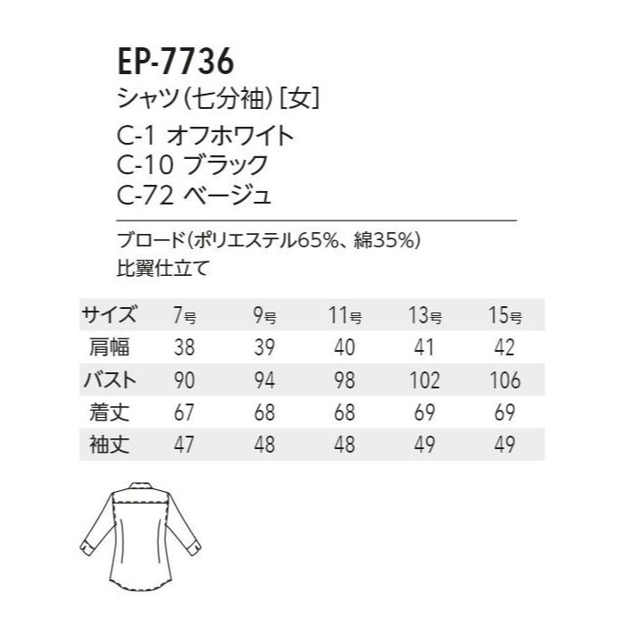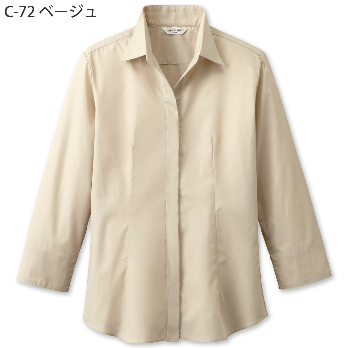 女性用の七分袖開襟シャツ。ベージュ。ボタンが見えない比翼タイプでスッキリとした印象に。ボディラインを美しく見せてくれるデザインです。スマートな装いが女性らしさを引き立たせます。店舗在庫限りで販売終了となります。返品交換不可です。