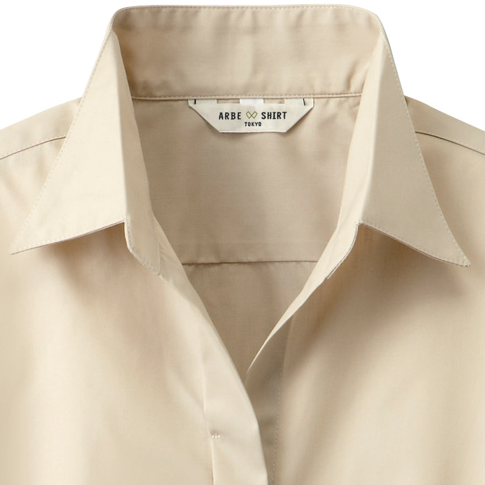 女性用の七分袖開襟シャツ。ベージュ。