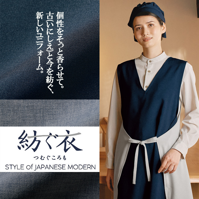 伝統と現代が融合。伝統的なデザインや色彩を取り入れつつ、着心地や動きやすさにこだわったシリーズ「紡ぐ衣(つむぐころも)」。個性をそっと香らせて。古(いにしえ)と今を紡ぐ、新しい和風飲食店ユニフォームです。