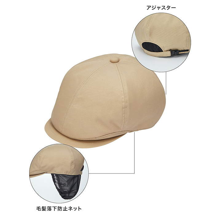 髪の毛の落下を防止するネット付きのハンチング帽。アジャスターが付いていて頭囲57~61cmまで対応しています。