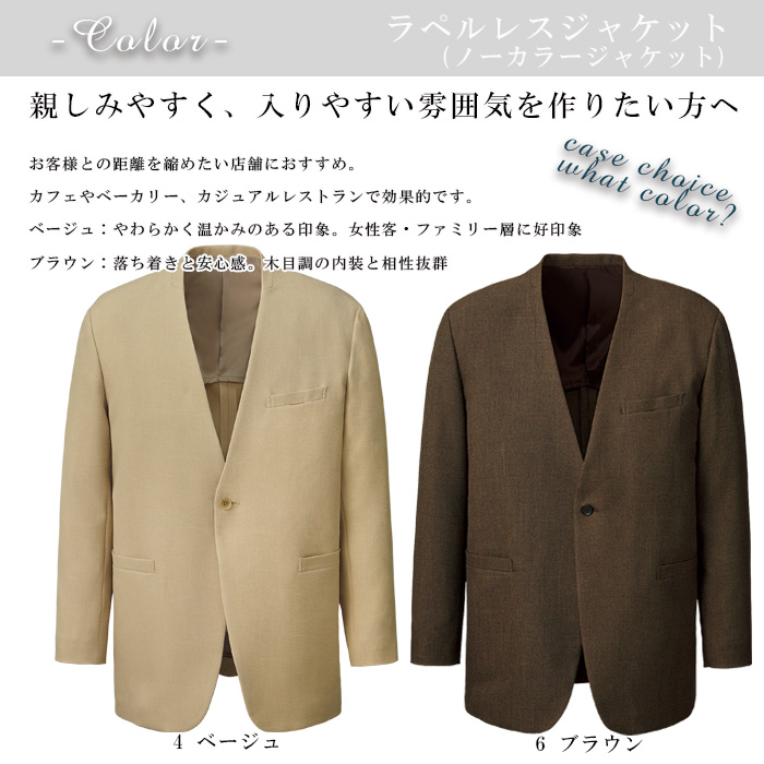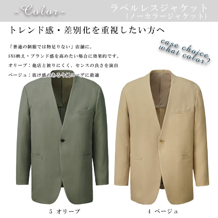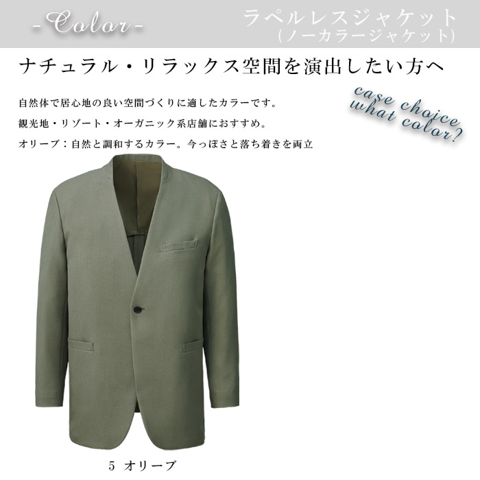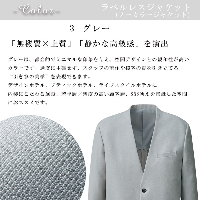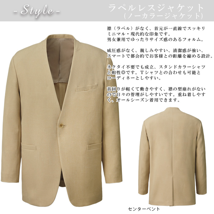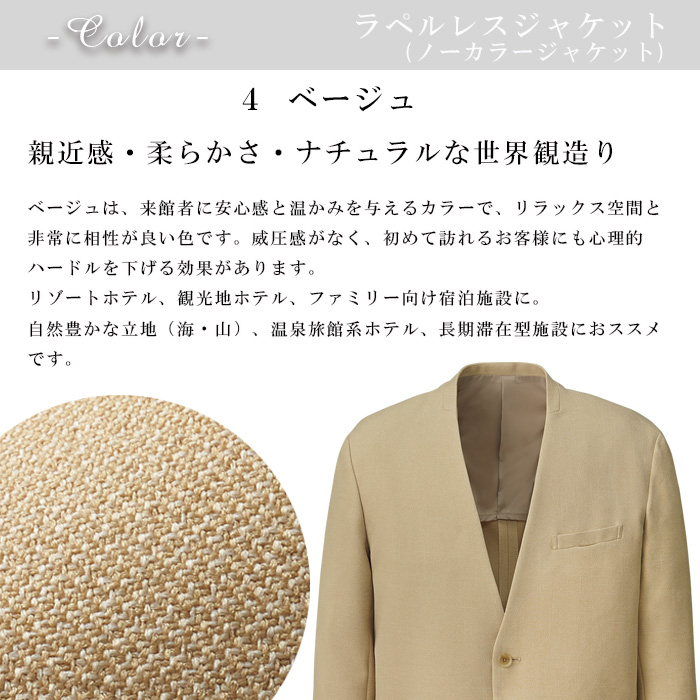 【ホテル飲食店ユニフォーム】ラペルレス ノーカラージャケット【ホテル・接客向け】紡毛調ポリエステル|男女兼用・家庭洗濯OK・センターベンツ