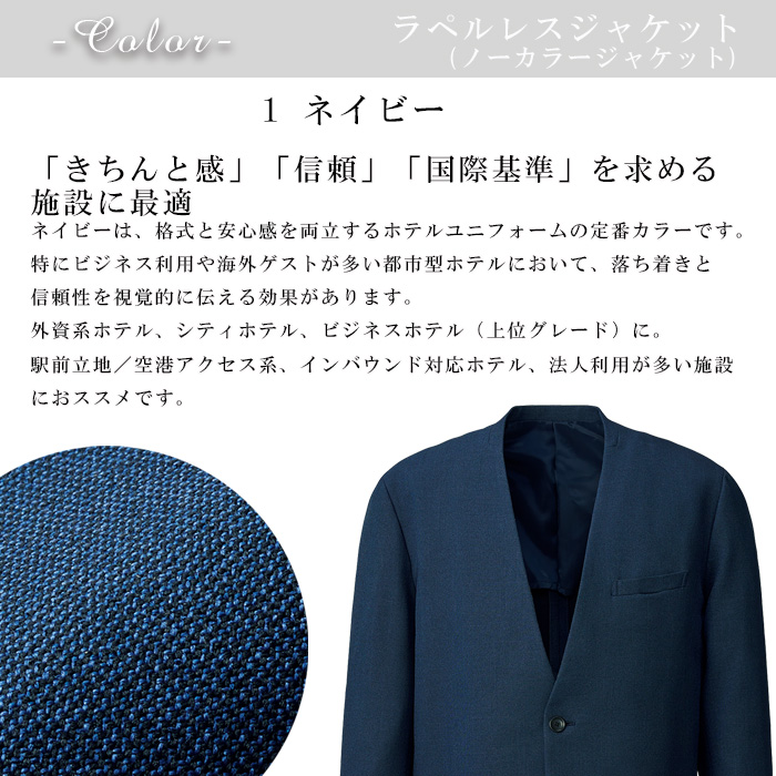 高級感・快適性・運用効率を兼ね備えたこのジャケットは、これからのホテルユニフォームの新しい基準となる一着。スタッフの印象を整え、施設全体の価値を高めるための最適な選択です。