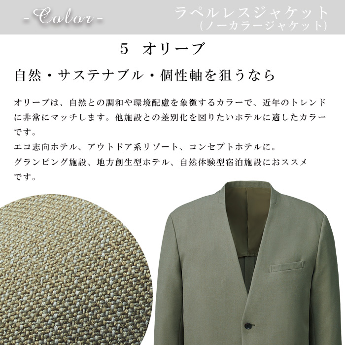 デザインは、トレンド感のあるノーカラー仕様。襟のないミニマルなデザインは、フォーマル過ぎず柔らかさを感じさせ、ゲストに対して親しみやすく洗練された印象を与えます。フロントラインはすっきりと整えられ、シャツやインナーとのコーディネートもしやすく、施設のコンセプトに応じた多彩なスタイリングが可能です。
