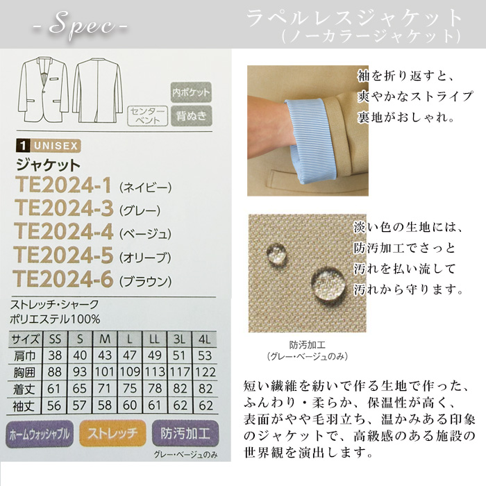 デザインは、すっきりとしたノーカラー仕様。首元を美しく見せるミニマルなラインで、従来のテーラードジャケットよりも柔らかく親しみやすい印象を与えます。背面にはセンターベンツを施し、動きやすさと美しいシルエットを両立。立ち姿だけでなく、歩行や作業時にもストレスのない着心地を実現しています。