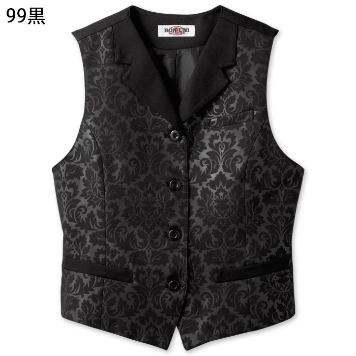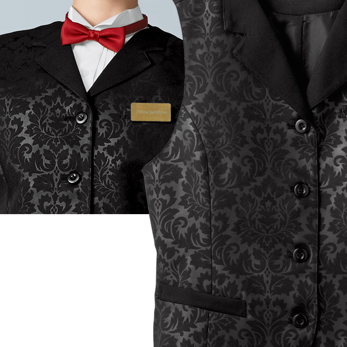 【飲食店販売店制服】襟付きエンボスブラックベスト【女性用】エレガントで格調高いダマスク柄