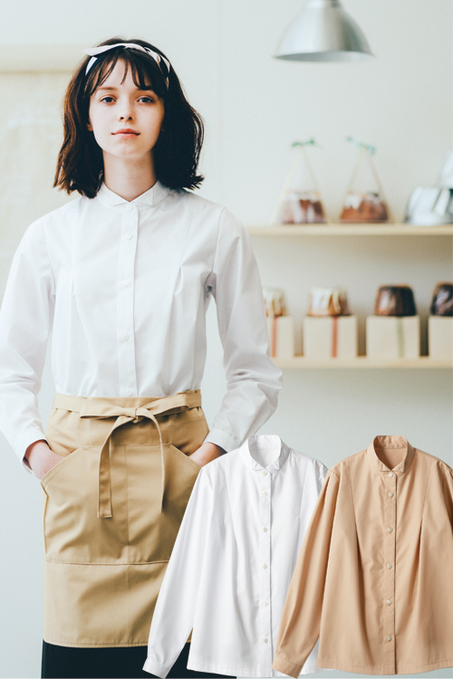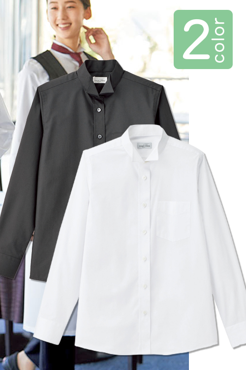 【飲食店販売店制服】襟の立て方で、3タイプの着こなし 長袖シャツ【2色】女性用