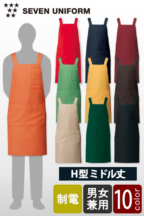 飲食店販売店制服 セブンユニフォーム10色から選べるシリーズ H型ミドル丈エプロン【10色】兼用