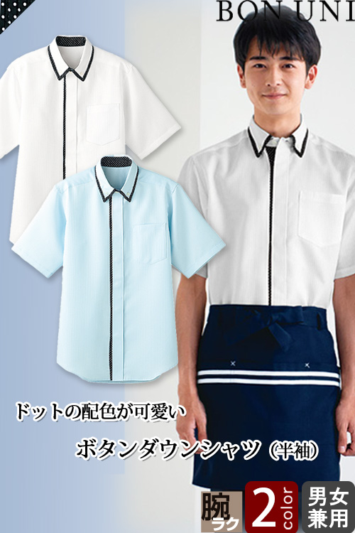 飲食店販売店制服 ボタンダウンシャツ(半袖)【兼用】2色 ドットの配色が可愛い爽やかシャツ