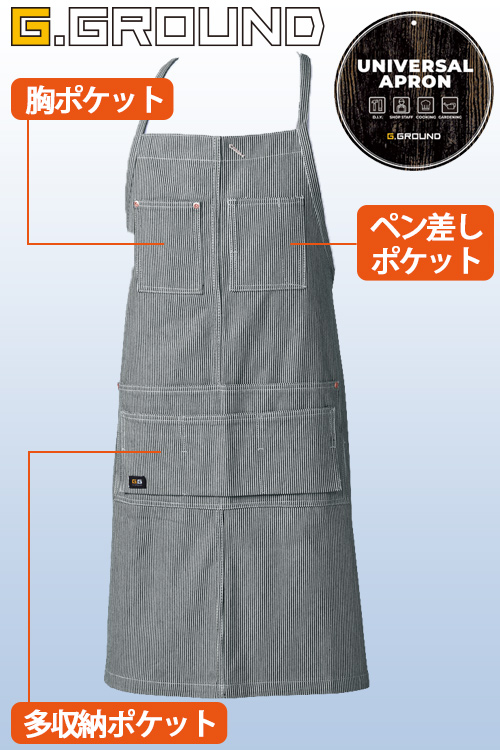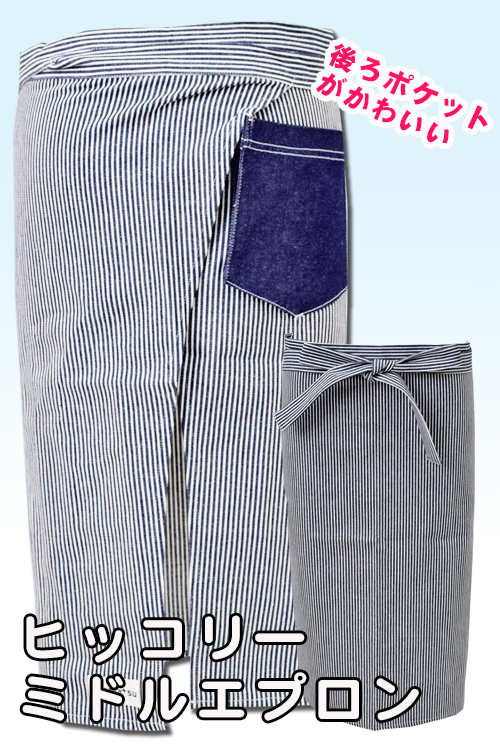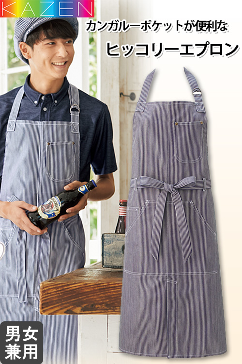 【飲食店販売店制服】エプロン【兼用】ヒッコリーストライプ 90cm丈 カンガルーポケットで収納力抜群