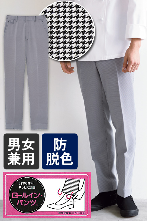 飲食店販売店制服 超簡単!折り込むだけの丈調整 ロールインパンツ【千鳥格子】男女兼用
