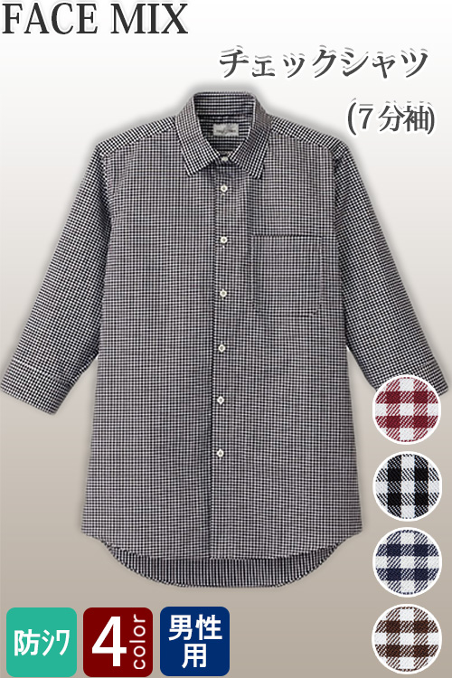 【飲食店販売店制服】 カジュアルシャツ(七分袖)【男性用】ワイドカラーのギンガムチェックシャツ