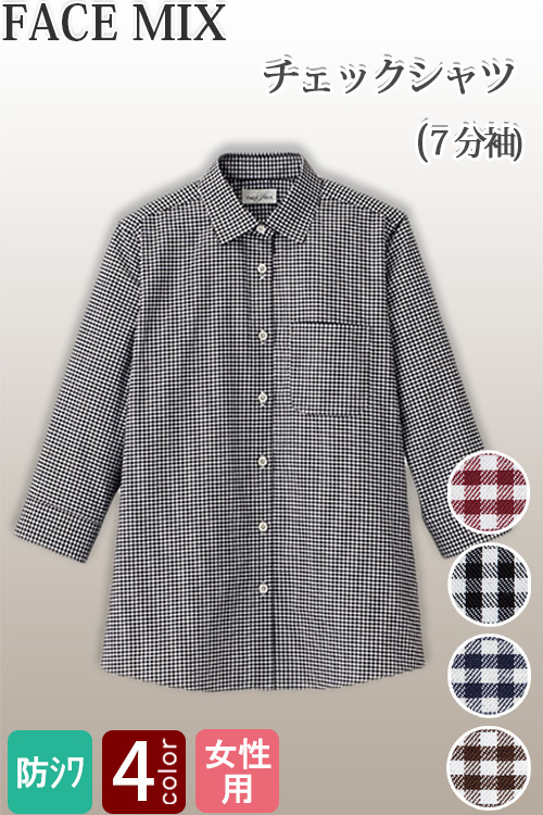 【飲食店販売店制服】 カジュアルシャツ(七分袖)【女性用】ワイドカラーのギンガムチェックシャツ