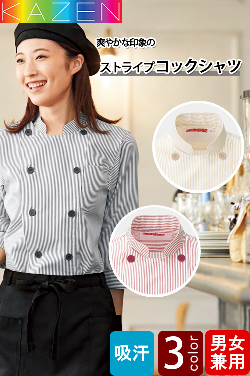 【飲食店販売店制服】ストライプ柄 長袖 スタンドカラーシャツ4色【男女兼用】オーバーシルエット