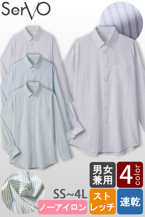 【飲食店販売店制服】ストライプ長袖シャツ【兼用】軽くてなめらかストレッチ シワになりにくい