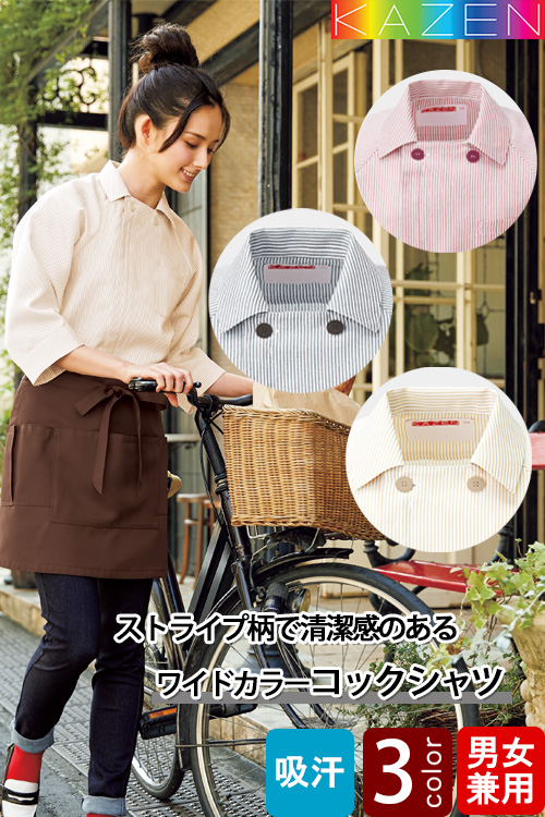 【飲食店販売店制服】ベルカラーシャツ(七分袖)【女性用】 4色 ビタミンカラーのストライプシャツ