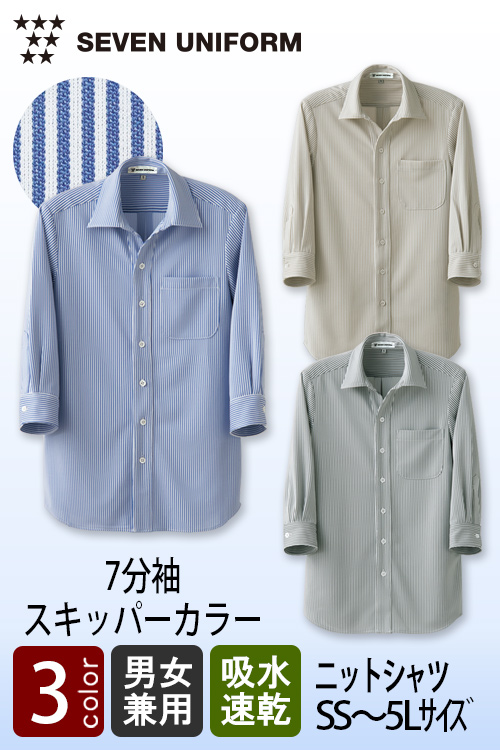 飲食店販売店制服 伸縮性があり軽い着用感 ストライプ柄スキッパー7分袖ニットシャツ【3色】兼用