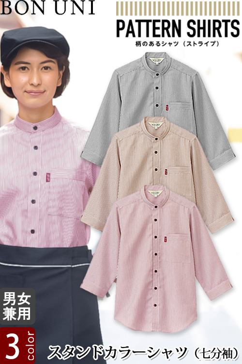 【飲食店販売店制服】スタンドカラーシャツ 七分袖【兼用】3色 シワになりにくく、耐久性あり