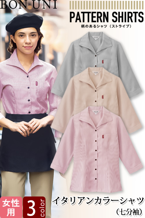 【飲食店販売店制服】イタリアンカラーシャツ 七分袖【女性用】3色 シワになりにくく、耐久性あり