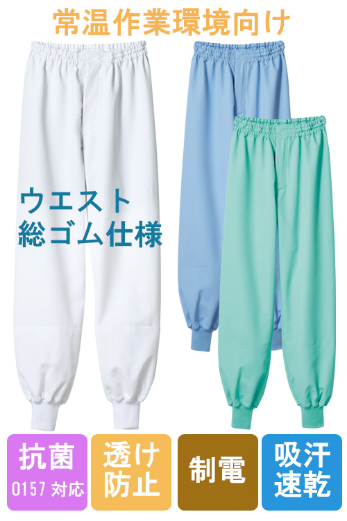 【食品工場食品販売店制服】O157HACCP支援パンツ3色男女兼用腰ゴム常温作業 制電、吸汗速乾