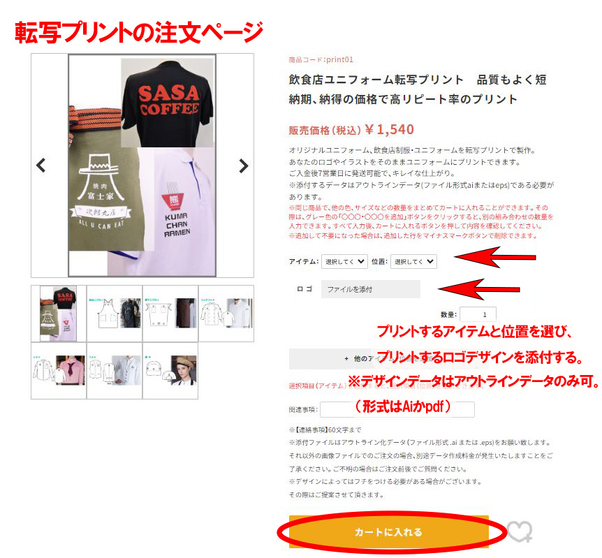 【2】プリント商品を選び、必要事項を選択、プリントデータを添付してカートに入れます。